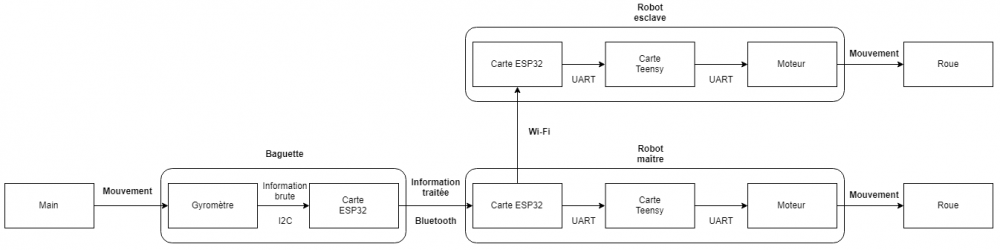 L'utilisateur doit pouvoir commander un robot "maître" à distance au moyen d'une baguette. Deux robots esclaves doivent, en temps réel, imiter les mouvements du maître.