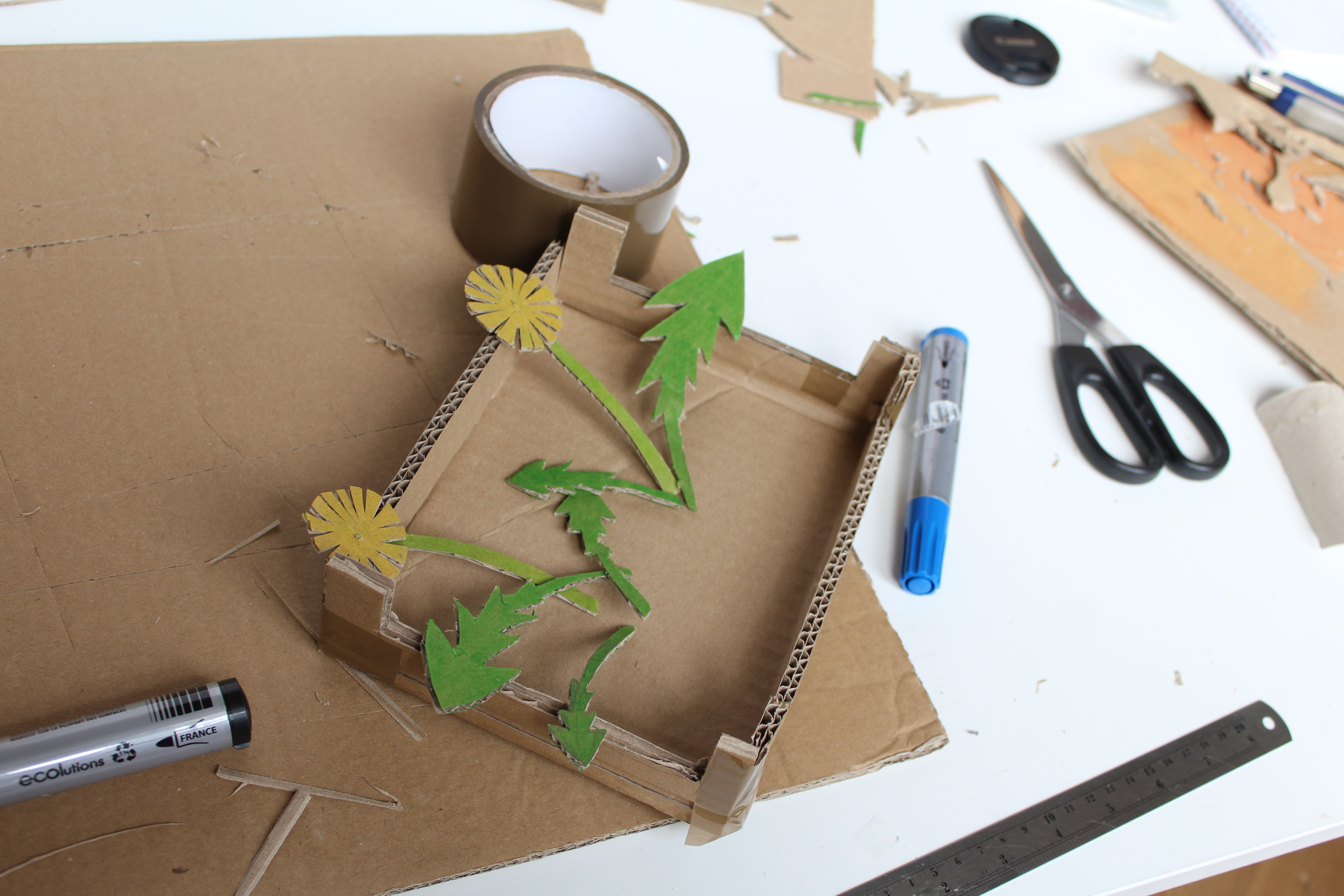 Des pissenlits en carton et coloriés pour compléter la maquette "Boîte d'expo"