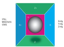 Pour simplifier la compréhension de l’accéléromètre, imaginez une balle. Si nous imaginons cette balle dans un endroit sans champ gravitationnel ou sans d’autres champs qui pourraient affecter la position de la balle - la balle flottera simplement au milieu de la case.